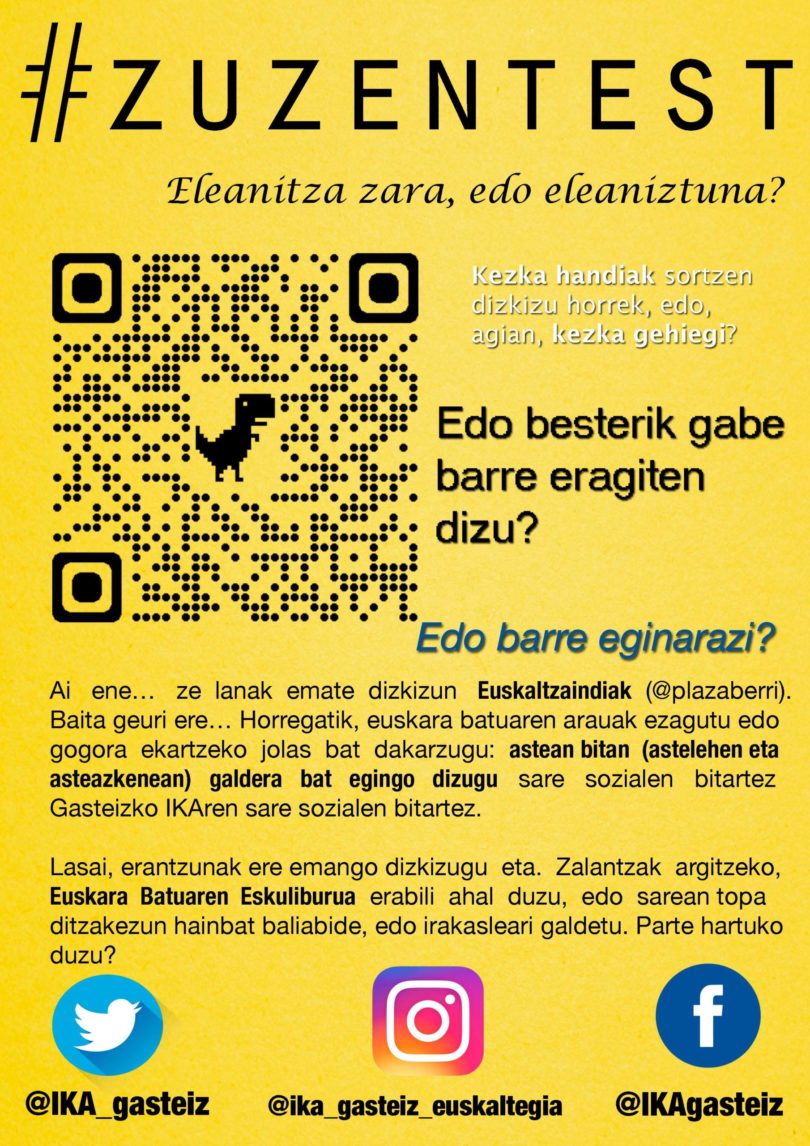 Ai ene… ze lanak ematen dizkizun Euskaltzaindiak (@plazaberri). Baita geuri ere… Horregatik, euskara batuaren arauak ezagutu edo gogora ekartzeko jolas bat dakarzugu: astean bitan (astelehen eta asteazkenean) galdera bat egingo dizugu sare sozialen bitartez Gasteizko IKAren kontuen bitartez.